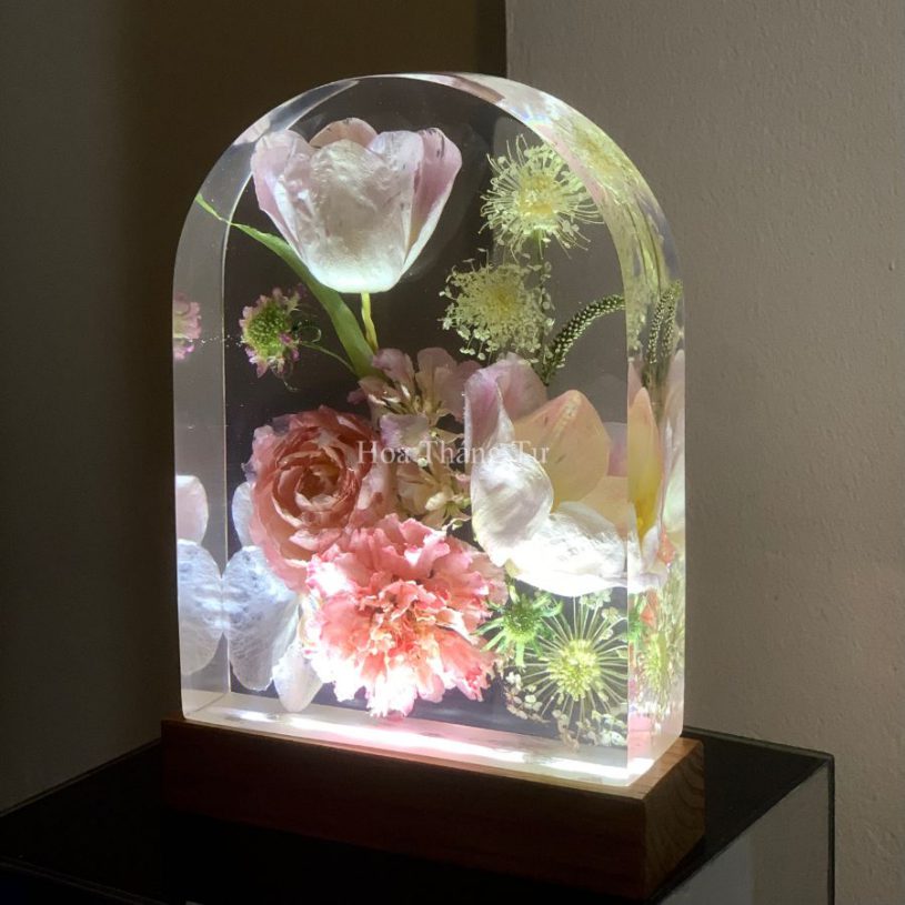 🌷 Khi lớp nhựa phản chiếu ánh sáng nhẹ nhàng, bông hoa bên trong trở nên lung linh như đang nằm trong một viên pha lê.
